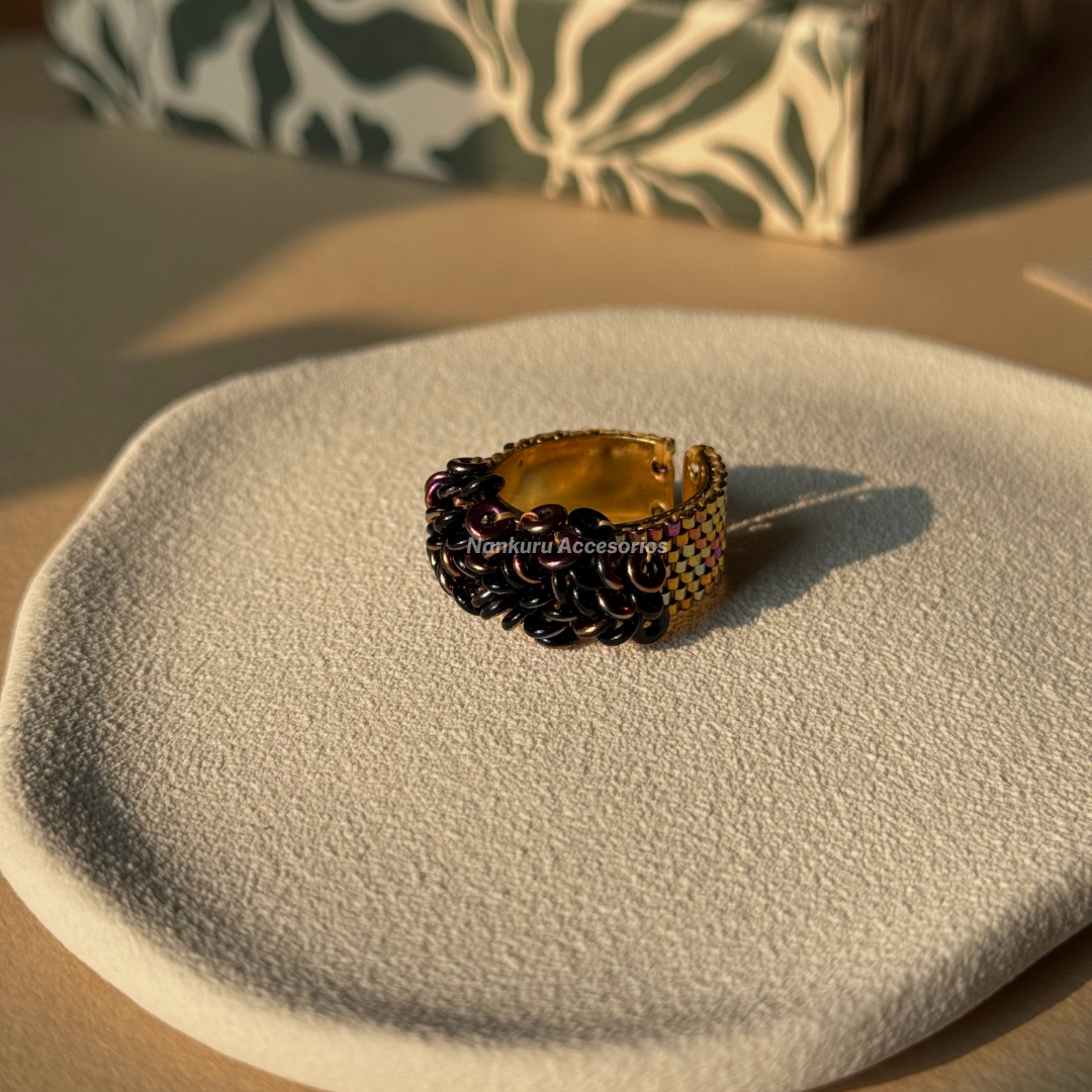 El anillo Ondina está tejido a mano con detalles únicos que lo hacen especial. Su diseño ajustable se adapta a cualquier tamaño, combinando comodidad y estilo en una pieza versátil para el día a día o para ocasiones especiales.